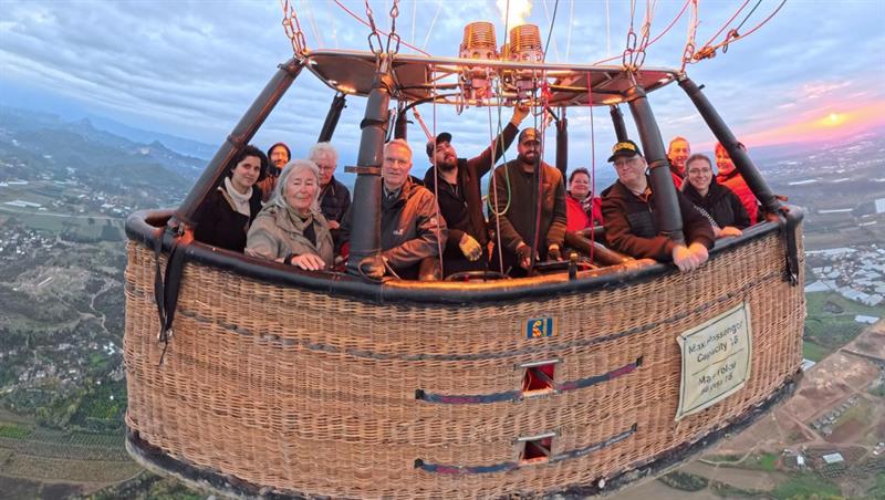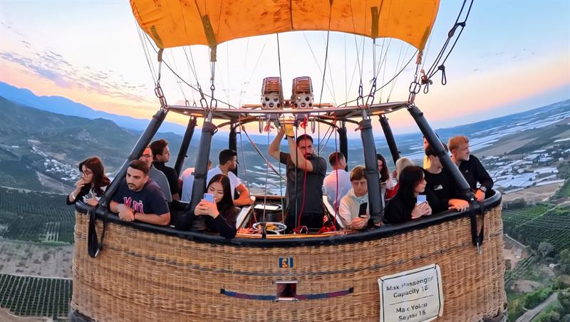 During our hot air balloon tour in the Serik–Aspendos region, balloons can reach altitudes of up to approximately 600 meters (2,000 ft). The flight duration is around 1 hour, and each balloon basket accommodates an average of 16 passengers. Alanya hot air balloon tours operate daily throughout the year, subject to suitable weather conditions.