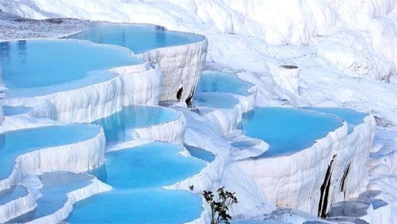 Ces terrasses d’un blanc éclatant se sont formées au fil de milliers d’années grâce aux eaux thermales riches en minéraux qui coulent le long de la colline, laissant derrière elles de magnifiques formations calcaires.